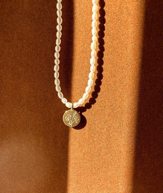 Romantic Rice Pearl Necklace with 14k Rose Medal Pendant